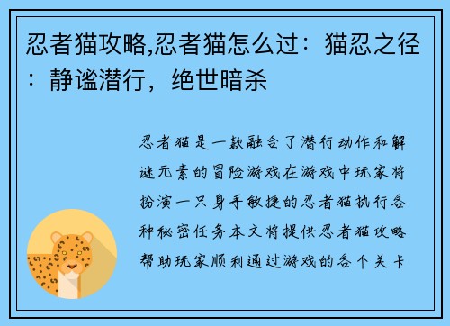 《忍者猫》是一款融合了潜行、动作和解谜元素的冒险游戏。在游戏中,玩家将扮演一只身手敏捷的忍者猫,执行各种秘密任务。本文将提供《忍者猫》攻略,帮助玩家顺利通过游戏的各个关卡。