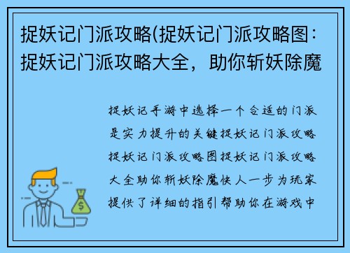 《捉妖记》手游中,选择一个合适的门派是实力提升的关键。捉妖记门派攻略(捉妖记门派攻略图:捉妖记门派攻略大全,助你斩妖除魔快人一步)为玩家提供了详细的指引,帮助你在游戏中快速成长,斩妖除魔无往不利。